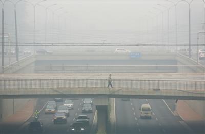 昨日,白石桥,一位市民走在雾霾中。当日,北京空气质量达到严重污染。 新京报记者 浦峰 摄