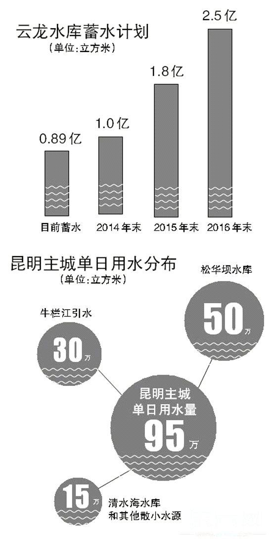 截至昨日,云龙水库库容为8945.72万立方米,按照蓄水计划,2014年末云龙水库确保恢复蓄水1.0亿立方米、2015年末恢复蓄水1.8亿立方米,2016年末恢复蓄水2.5亿立方米。云龙水库管理处处长刘志强表示,按照云龙水库每天几十万方的来水,实现年底1.0亿立方米的蓄水目标难度应该不大,加上云龙水库上游的双化水库应该可以实现1.2亿立方米的蓄水目标,更好地保障昆明明年的用水。
