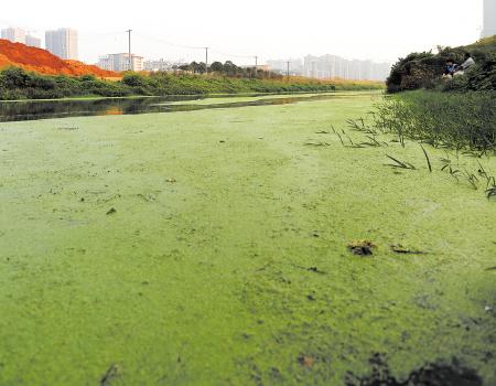 昨日下午,记者来到圭塘河与雨花区劳动东路的交汇处,在劳动东路桥下,不少绿油油的浮萍顺着河水往下游漂去。沿岸水流较缓的区域,停留着一片片浮萍。“以前虽然有浮萍,但没有这么多,最近不知道怎么了,突然长了这么多。”河畔建筑工地的保安刘先生告诉记者,前几天这里的浮萍多得覆盖了整条河段,昨日已经有所减少,“上游估计更多。”