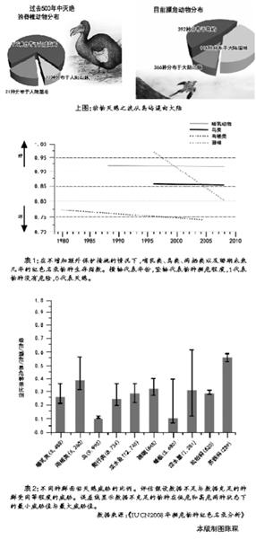 地球出现生命以来,已有5亿多种生物生存过。物种灭绝本是生命进化史的一种自然现象,但自从人类进入工业社会,物种灭绝的时间表大大提前。地质时代,鸟类平均300年灭绝一种,兽类平均8000年灭绝一种;到1600~1700年,每10年灭绝一种;1850~1950年,鸟兽的平均灭亡速度为每年一种,而且这种灭绝还在以加速度的趋势进行着。