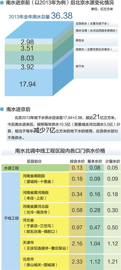 日前国家发改委对外发布《关于南水北调中线一期主体工程运行初期供水价格政策的通知》规定,中线工程实行两部制水价,基本水价按合理偿还贷款本息、适当补偿工程基本运行维护费用的原则制定,计量水价按补偿基本水价以外的其他成本费用及计入规定税金的原则制定。基本水费按基本水价乘以规划分配的分水口门净水量计算,计量水费按计量水价乘以实际口门用水量计算。水源工程和干线工程各口门基本水价、计量水价可在国家发改委网站上查询。