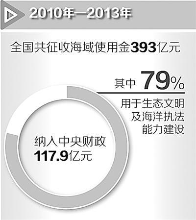 本报北京1月13日电 (记者余建斌)记者从国家海洋局获悉:2010年—2013年全国共征收海域使用金393亿元,纳入中央财政117.9亿元,共返还92.9亿元,用于海域海岸带整治修复项目、海岛整治修复项目、海洋环境保护与生态修复,以及海洋执法能力建设等,约占中央海域使用金征收总额的79%。