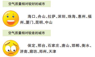 这位负责人介绍说,按照《环境空气质量标准》评价,2014年,京津冀、长三角、珠三角等重点区域和直辖市、省会城市及计划单列市共74个城市中,海口、拉萨、舟山、深圳、珠海、福州、惠州和昆明8个城市的细颗粒物(PM2.5)、可吸入颗粒物(PM10)、二氧化氮(NO2)、一氧化碳(CO)和臭氧(O3)等6项污染物年均浓度均达标,其他66个城市存在不同程度超标现象。2014年空气质量相对较好的前10位城市分别是海口、舟山、拉萨、深圳、珠海、惠州、福州、厦门、昆明和中山;空气质量相对较差的前10位城市分别是保定、邢台、石家庄、唐山、邯郸、衡水、济南、廊坊、郑州和天津。