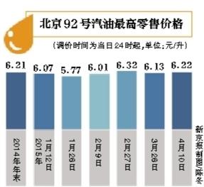 4月10日,国家发改委发布通知,决定将汽、柴油价格每吨分别提高120元和115元,测算到零售价格90号汽油和0号柴油(全国平均)每升分别提高0.09元和0.1元,调价执行时间为4月10日24时。北京市发改委发布的调价通知显示,92号汽油最高零售价从6.13元/升上调0.09元至6.22元/升。