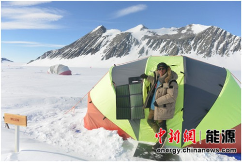 图为中国登山界青年代表、2008年奥运会珠峰传递火炬手黄春贵在南极使用汉能薄膜发电充电包(50W),他评价称:“不是夸张,更不是吹捧。我真的感觉汉能移动能源产品,用了之后就离不开。”