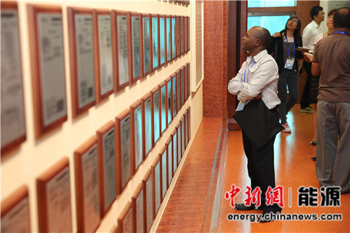 汉能把“用清洁能源改变世界”作为己任,在薄膜太阳能领域拥有两千多项专利,众多业内顶尖的专家。图为“南南合作”代表团参观汉能专利墙。