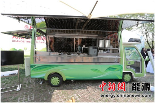 图为汉能推出的太阳能全工作用电餐车。