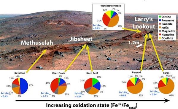 同时,来自穆斯堡尔光谱仪与微热放射光谱仪的数据显示,岩石中的矿物质成分发生改变,晶体结构减少,非晶体结构增加。这与勇气号全景相机、显微成像仪所获得的岩石表面存在很多小凸起的图像特征相匹配。
