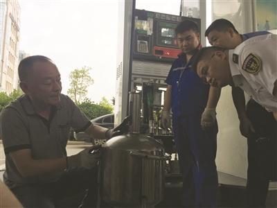 质监计量人员在检查加油站加的油计量是否准确。 薛玲 摄