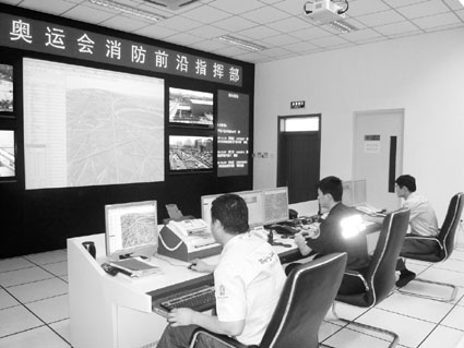 ▲消防官兵正在奥运消防前沿指挥部紧张工作