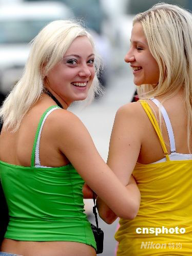 8月18日,北京奥运赛程进入高潮,鸟巢、水立方等场馆比赛吸引众多外国游客观战。 图为两位外国靓女在北京感受奥运盛会。中新社发 陈文 摄