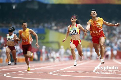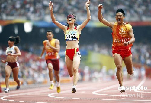 9月9日,北京残奥会田径比赛在北京国家体育场“鸟巢”展开第二个比赛日的争夺,在女子100米T11级决赛中,中国选手吴春苗以12秒31夺得金牌,并打破残奥会纪录。中新社发 盛佳鹏 摄