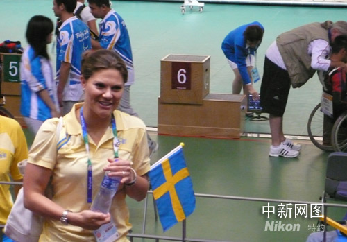 瑞典王位继承人、31岁的大公主维多利亚(图中黄衣者)9月9日前往位于北京西郊的北京残奥会射击场,为选手们加油助威。中新社记者 宋方灿 摄