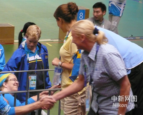 图为维多利亚公主祝贺瑞典选手获得十米气步枪卧射比赛的铜牌。