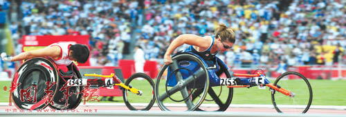 竞速轮椅大轮直径不得超过70厘米,小轮直径不得超过50厘米,而且重量特别轻,运动员一只手就可以提起来。在比赛中可以看到,运动员重心稍稍向后移一点,竞速轮椅的前轮就能离开地面。而且,竞速轮椅的结构也很特殊,宽度以刚刚卡住运动员的胯部为最佳。本届残奥会上,还出现了一款用F1跑车材料制造的新型竞速轮椅,据说风阻非常小。