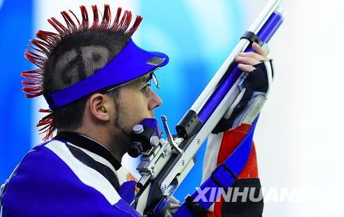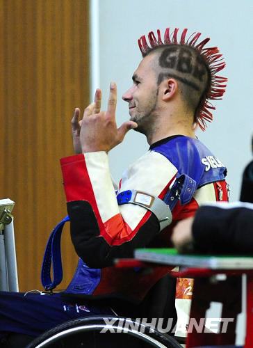 9月11日,在北京2008年残奥会R3混合组10米气步枪卧射--SH1决赛中,英国选手马特·斯克尔霍恩以704.9环的总成绩获得冠军。他的“刺头”发型引人注目。 新华社记者 任勇 摄