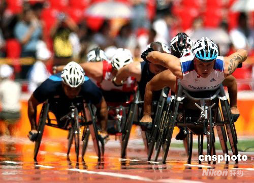 9月11日上午,北京残奥会田径比赛继续在奥林匹克公园内的国家体育场“鸟巢”举行,观众爆满,而参加男子800米-T54预赛的选手冒着灼人的阳光奋勇争先。 中新社发 任晨鸣 摄