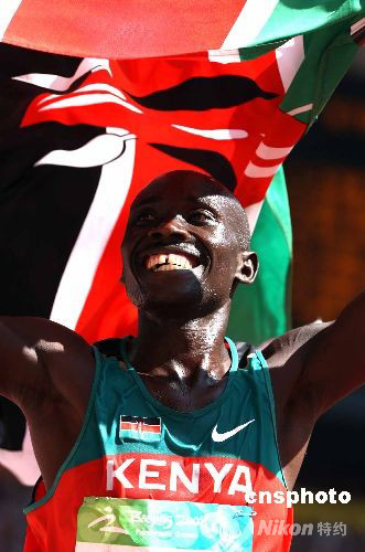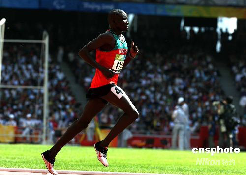 9月11日上午,北京残奥会田径比赛继续在奥林匹克公园内的国家体育场“鸟巢”举行,在男子5000米-T13级决赛中,肯尼亚选手亨利·基普罗诺·基鲁瓦轻松夺冠,并以14分24秒02的成绩打破残奥会纪录。 中新社发 任晨鸣 摄