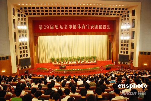 9月11日,由中共中央宣传部、中央直属机关工委、中央国家机关工委、教育部、国家体育总局和北京市委联合举办的第29届奥运会中国体育代表团报告会在人民大会堂隆重举行。中新社发 杨慧峰 摄