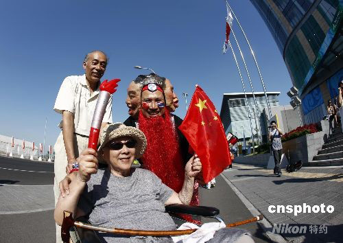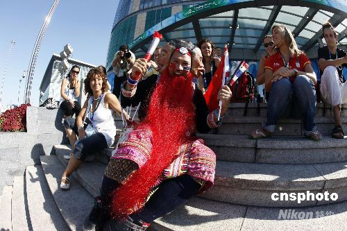 9月11日,来自泰国的游客一身古装打扮在北京残奥会主新闻中心前留念。中新社发 杜洋 摄