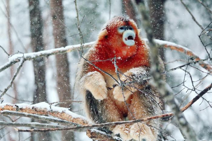 湖北寒潮来袭 金丝猴“雪中作乐”