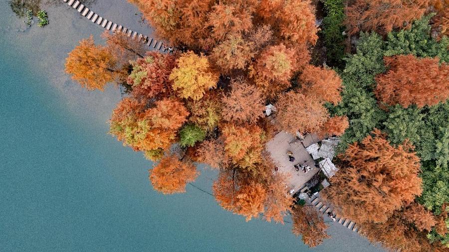 重庆彩云湖国家湿地公园冬日水杉“换装”引游人