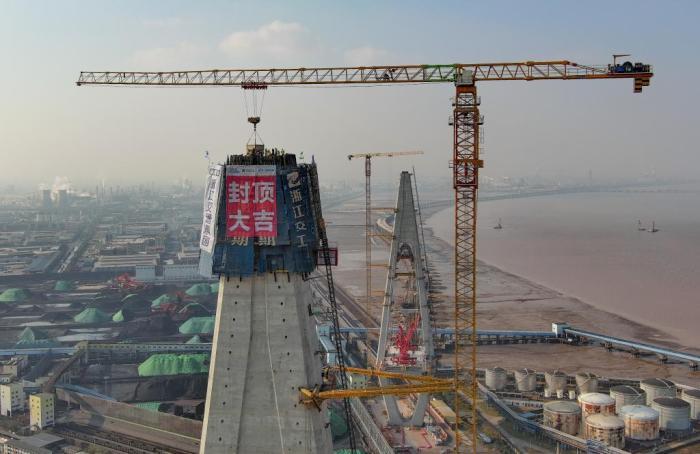 世界最大跨径的三塔不对称斜拉桥——甬江特大桥三塔封顶