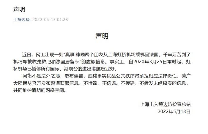 有人从上海虹桥乘机被收走护照?上海边检:虚假信息