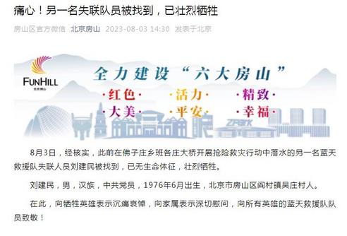 北京房山:另一名蓝天救援队失联人员刘建民被找到,已壮烈牺牲