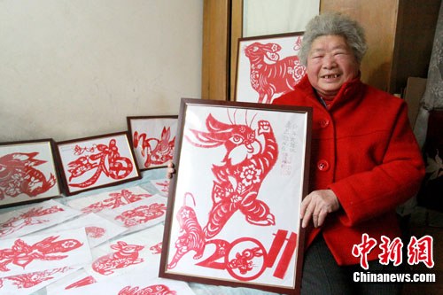 中新网徐州1月30日电 (记者 朱志庚 拾冠之)春节临近,江苏徐州的民间艺人们正加紧赶制“兔年”礼物,喜迎新春到来,其中74岁的剪纸老艺人孟宪云于近几日连夜创作出100幅玉兔剪纸,老人说,每到春节前都会创作很多生肖剪纸,今年也没例外,在剪制玉兔期间有时夜里醒来有了灵感,就躺在床上进行构图、创作。