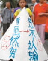 前日下午5时,杨家坪商社电器门前地下通道内,一名穿着黑色短袖T恤的男子坐在地上,头戴纸折的三角帽,帽上写着“中国乞丐”、“淘宝体”、“行为艺术”、“现代乞丐”、“哥虽然穷但从不认输”。他面前摆着一块纸板,上面写着“亲,哥肚子饿了,求10元钱买月饼。祝各位亲中秋节快乐,QQ:194×××××”