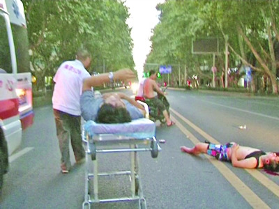 扬子晚报记者到达现场时,道路已经恢复畅通,但是地上仍然可以看见明显的血迹。据目击者描述,由于巨大的撞击,轿车的前挡风玻璃破了一个大洞,车头也瘪进去一块。其中一名男子穿花裤衩,倒在双黄线上一动不动,另外一个则满脸是血,倒在地上一直喊疼。周围还散落着一些相机器材,有目击者看到是一部佳能相机,机身上面还带有手柄,已经摔坏了,路边还有三脚架、长焦镜头等。