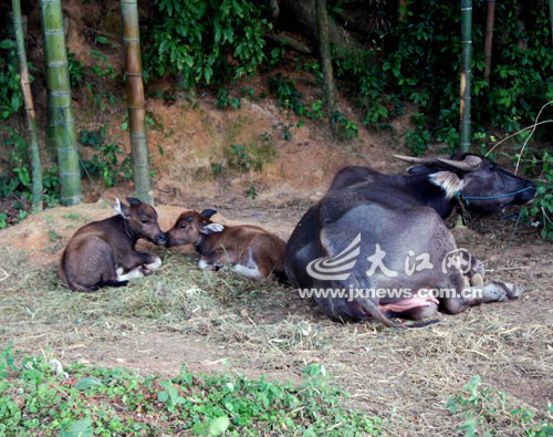 据婺源县畜牧兽医局专家介绍,牛是单胎生动物,在自然条件下生双胞胎的几率在五万至十万分之一左右;而生下龙凤胎更是凤毛麟角,几率约为百万分之一,在全国都非常少见。(江南都市报 国红、潘雷、记者王敏君/摄)