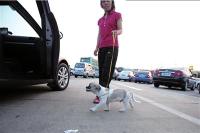 昨天早晨,一名堵在深圳机荷高速荷坳收费站前的 乘客下车遛起狗来。 图/东方IC