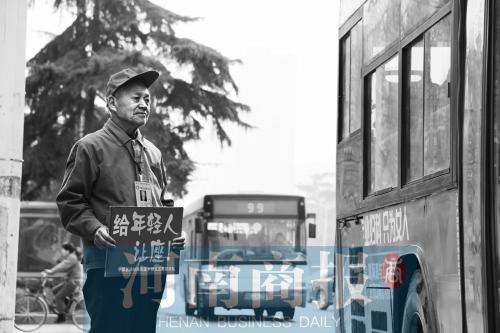 昨日上午7时30分许,郑州市建设路与桐柏路交叉口一处公交站牌附近,20多位头戴红帽的老年人志愿者发出了“给年轻人让座”的倡议。