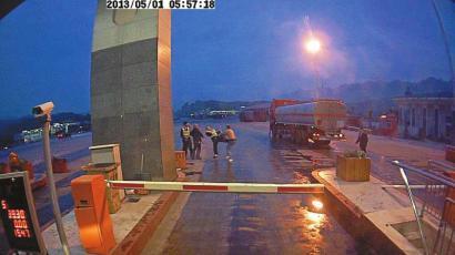 这4段视频是这辆车牌号为云F49215的大货车的行车记录仪拍摄下来的。其中“光膀子”是驾驶员李晓国,穿花格子衬衣的是另一名驾驶员李平,光头略矮的是李晓国的岳父,其余的五六人都是收费站工作人员。