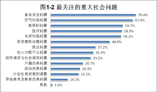 核心提示:近日,中国社会科学院中国舆情调查实验室发布第一次舆情指数。调查结果显示,在最受关注的重大社会问题方面,食品安全和空气污染是选择比例最高的两项,分别为70.4%和67.9%