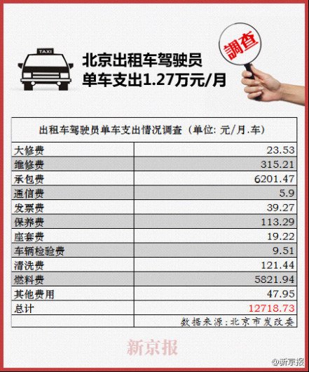 在此次出租车调价听证会上, 北京市发改委公布北京出租汽车成本监审结论:出租汽车企业单车月成本5279.85元;驾驶员承包费每月6201.47。“我们绝非暴利行业”,出租车企业代表在听证会上表示。