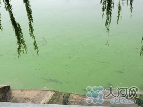 河南信阳浉河现大面积蓝藻 周围发出腥臭味(图)