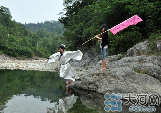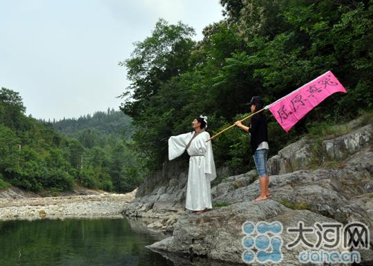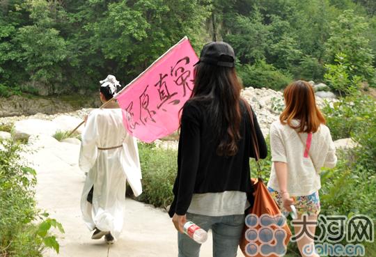 这名网友说,当天下午,一名身穿古装的男子在一名女伴的陪同下,扛着一面写有“屈原很冤”字样的旗子,突然出现在宝天曼天河冲浪的现场,只见他时而挥舞袍袖,时而仰天长啸,就在游人愣神的当口,他竟纵身从石头上跳下,好在水不深,他很快从水中爬上来,在众人疑惑的目光中,和女伴匆匆离去。