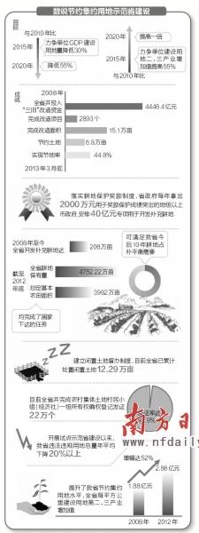 根据《方案》,与2010年比,广东将力争单位GDP建设用地量到2015年降低30%,到2020年降低55%;单位建设用地二、三产业增加值到2015年提高55%,到2020年提高一倍。