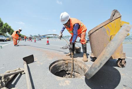 昨日,岳麓区市政局启动全区堵点堵头疏浚工作。这是工作人员正在潇湘路对下水道进行疏浚。 石祯专 摄