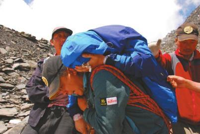 接近下午5点,首批救援队员及受伤山友一行下撤到了海拔约4200米的大本营。此时的蔡先生口吐白沫,意识不清。换了担架,救援队员抬着蔡先生往山下走。