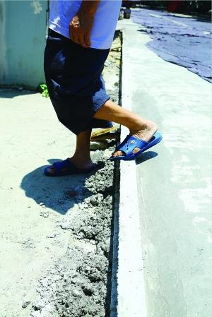 昨日上午,记者来到三经路的明鑫苑小区,看到该小区有两扇大门,北侧大门门口是原有的水泥路,而南侧大门门口则有一条新修好的水泥路。记者注意到,这条20米左右的水泥路是直接铺在原有的道路上修成的,因此比小区的路要高出20多厘米,而且路面没有修筑斜坡,边缘是垂直切断的。记者沿着修的路前进看到,在离明鑫苑南侧大门的不远处有一条小巷,水泥路在修到小巷时却修筑了一道斜坡。