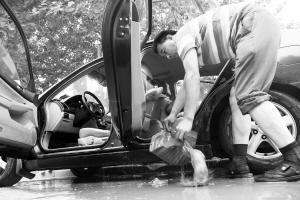 轿车司机高先生一边打开车门向外舀着水,一边无奈地说,他是山东人,来石谈生意,以前从这里经过时没有遇到过积水。“刚进入水中我就后悔了,可是再想出来已经不行了,随后车便被水憋灭了火。”光着膀子的高先生说。