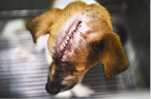 大人吵架小狗受牵连 头被菜刀劈开缝50多针(图)