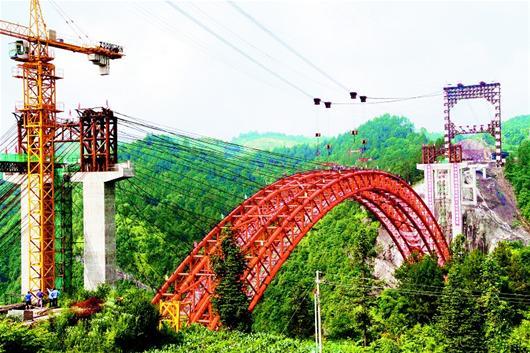 由于山区建桥施工场地狭小,地形复杂,在200多米深的峡谷高空架设钢拱,技术难度、安全风险极大。施工中,中铁大桥局五公司采用向下泵送混凝土施工方法,高差超过90米,创下当今国内同类型桥梁施工新纪录。此外,钢管热胀冷缩,变形量约为10厘米,15摄氏度左右的温度是合龙最佳时机,因此只能选择深夜施工。