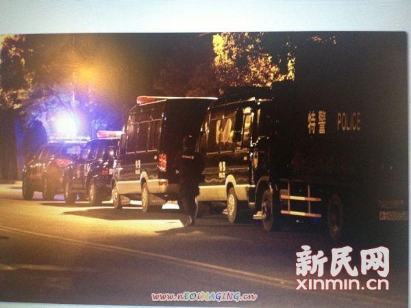 图说:事发现场看到的特警车队。 新民网记者 萧君玮 现场回传