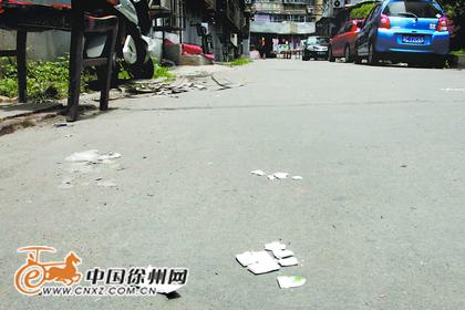 ▲楼上落下一个杯子,在地上摔得粉碎。 记者 秦媛 摄