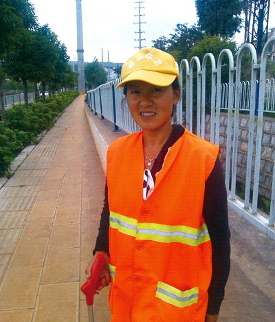 昨日中午,经过多番寻找,记者终于见到了这位年轻的环卫工妈妈小王。据了解,28岁的小王是公司里最年轻的环卫女工,她来自泸西县三塘乡, 2010年跟老公一家来到昆明打工。对于自己的事被发到了微博,小王感到很吃惊,“我只是指个路,换了别人也会说的,真的没什么。”